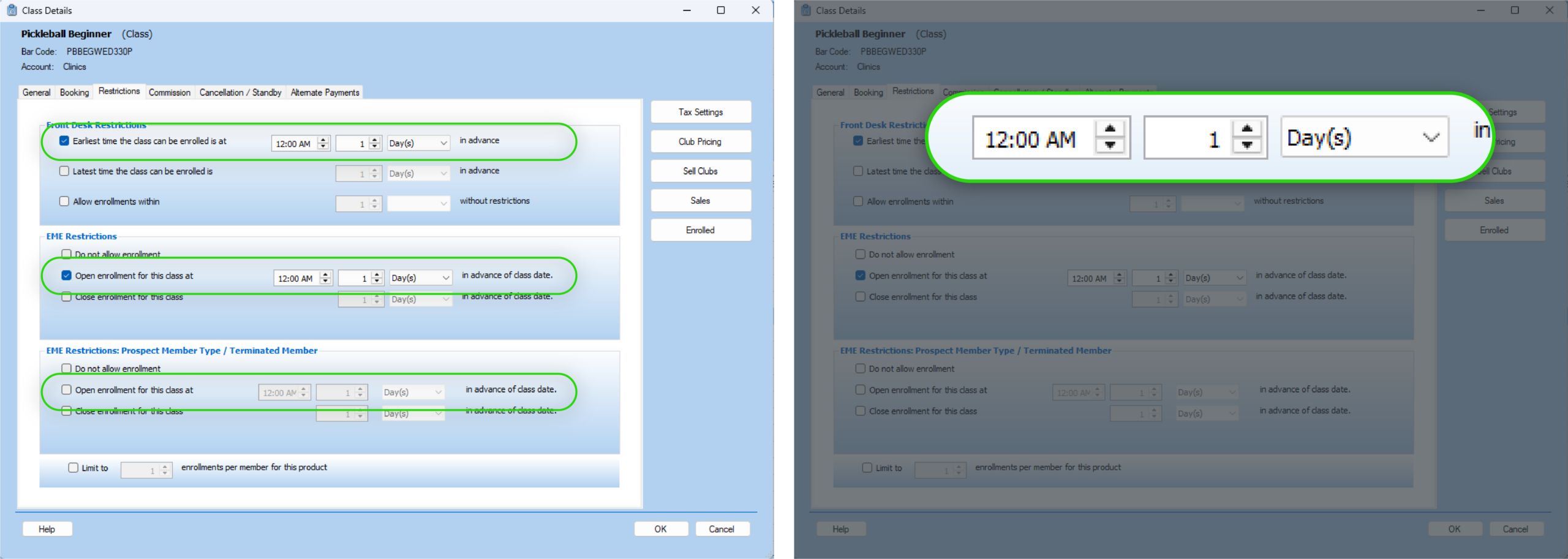 • Enhancement: Class product configuration now allows the user to select specific times to open enrollment under the Restrictions tab, instead of automatically defaulting to midnight when setting a certain number of days.